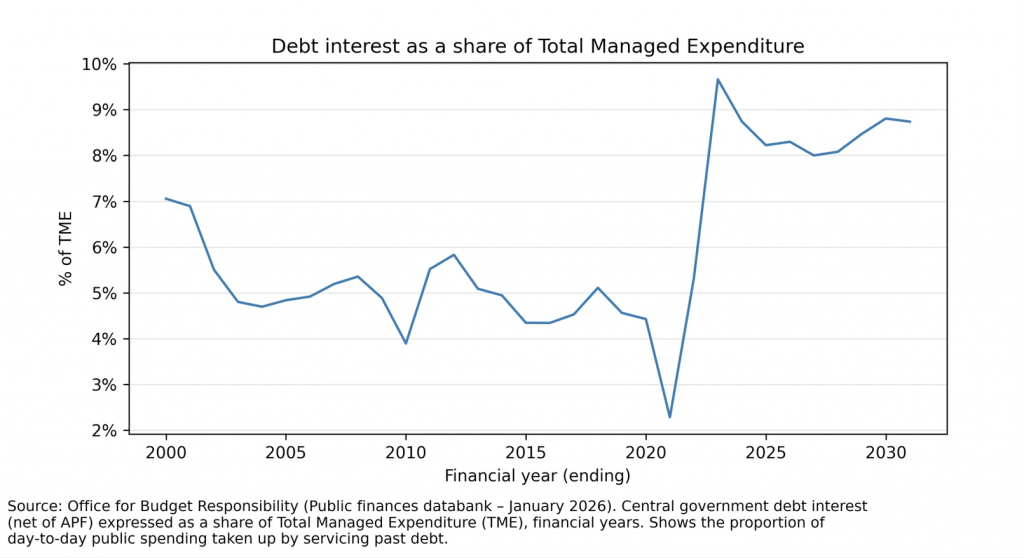 Which means that when the government spends more than £100 billion per year on debt interest, it is not an evenly shared cost. It falls most heavily on those earning the most — and those most likely to be in sustained employment over decades.